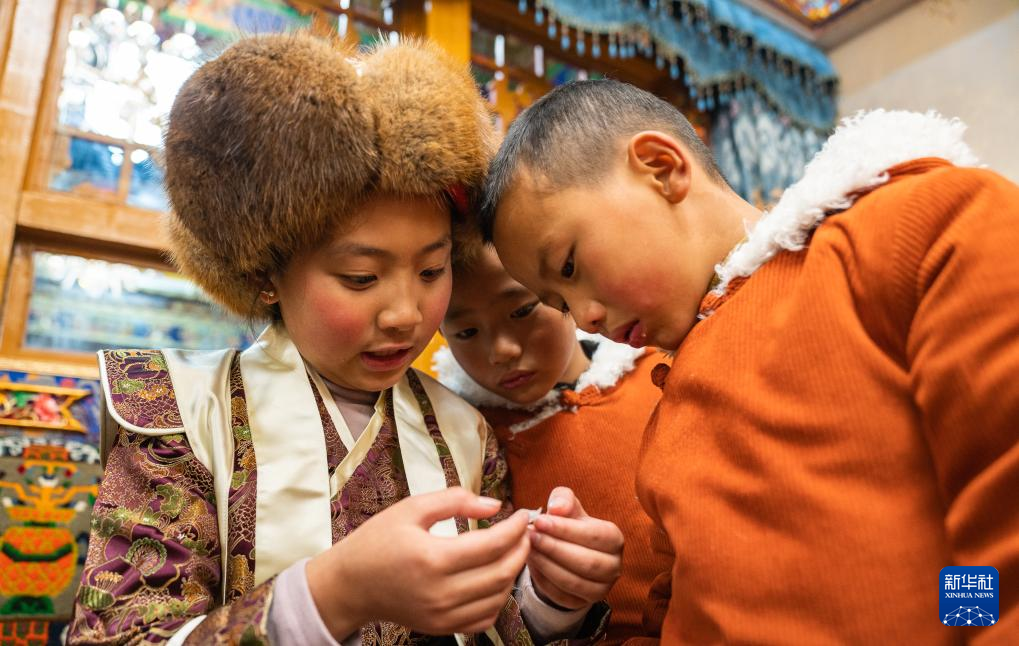 巴桑普尺家的孩子在查看“古突”里包裹的字條“餡兒”(1月10日攝)。新華社發(fā)(丁增尼達(dá) 攝)