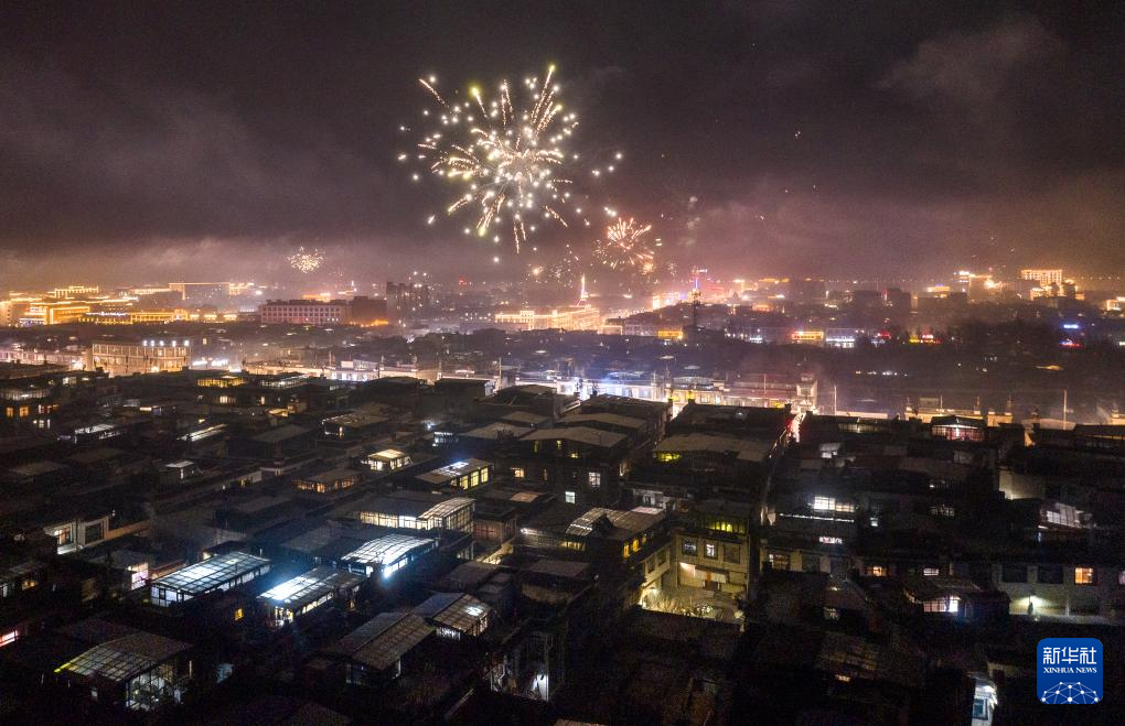 這是日喀則市桑珠孜區(qū)“古突”夜綻放的煙花(1月10日攝,無人機(jī)照片)。新華社發(fā)(丁增尼達(dá) 攝)