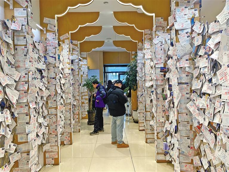 圖為游客在參觀獨具特色的“天上西藏”主題郵局明信片墻。記者 洛桑 攝