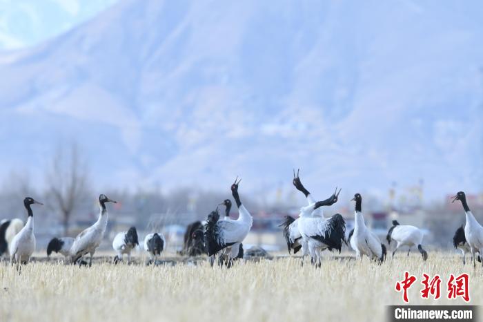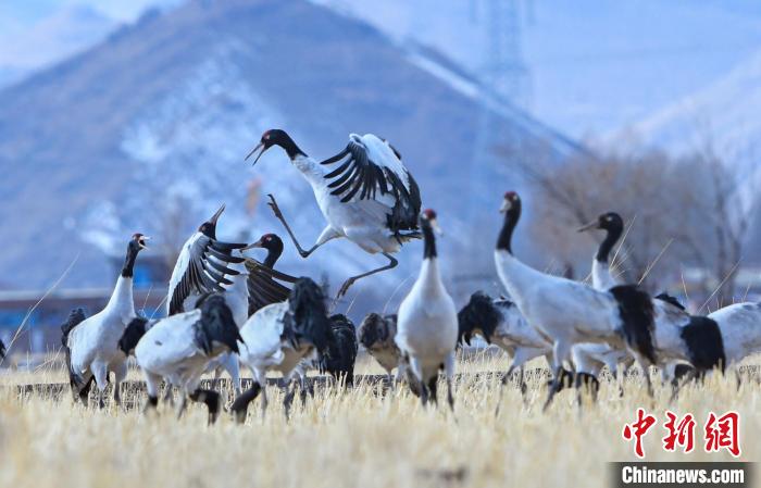 圖為拉薩林周縣黑頸鶴保護區(qū)內,黑頸鶴正在覓食、嬉戲。貢嘎來松 攝