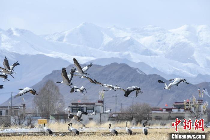 圖為拉薩林周縣黑頸鶴保護區(qū)內,黑頸鶴在雪山翱翔。貢嘎來松 攝