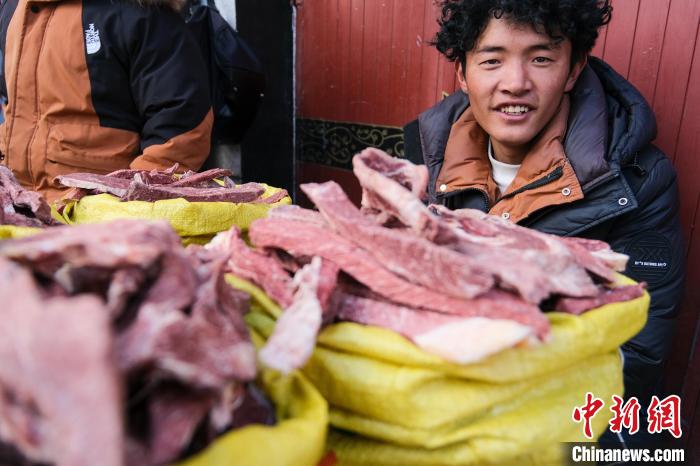 2月5日,來(lái)自那曲市班戈縣的年輕牧民格桑云丹守在自己的風(fēng)干牦牛肉攤位前。中新社記者 江飛波 攝