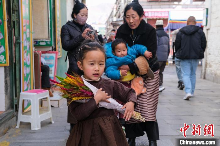 2月5日,拉薩沖賽康附近年貨市場(chǎng),4歲的旦增色宗抱著一把羅薩美朵。中新社記者 江飛波 攝