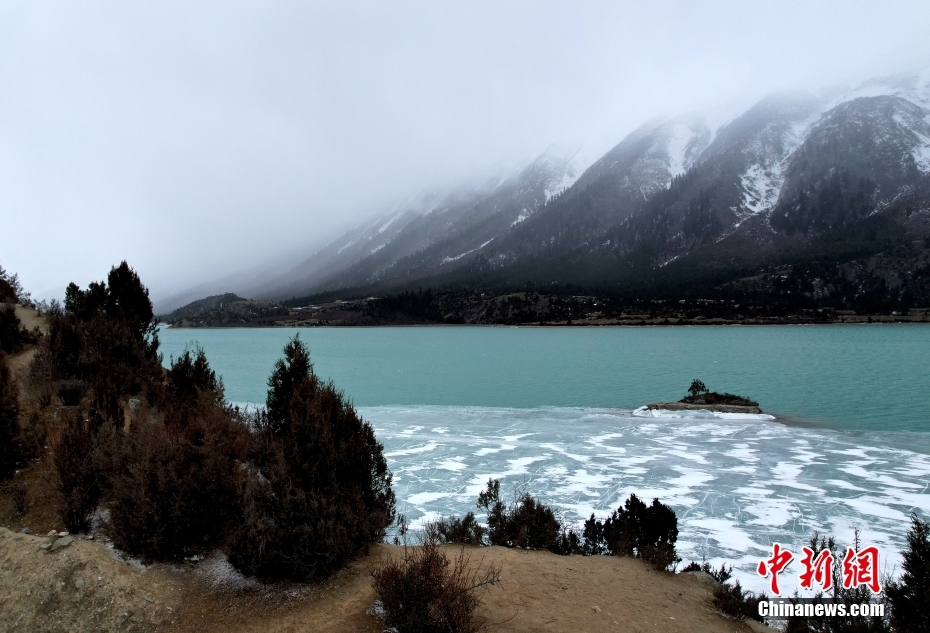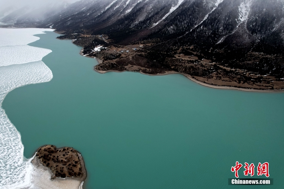 2月21日,西藏昌都市八宿縣,然烏湖半冰半水的湖面如畫(huà)一般,美不勝收。(無(wú)人機(jī)照片)中新社記者 李林 攝