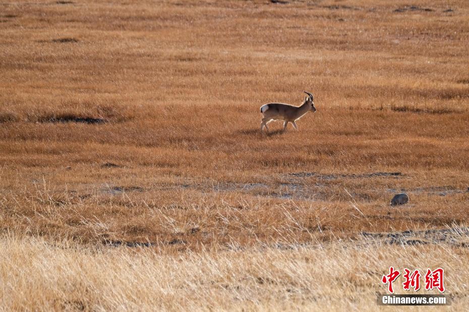 一只藏原羚在羊卓雍錯(cuò)湖畔濕地覓食。江飛波 攝