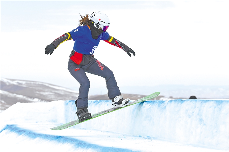 圖為獲得單板滑雪障礙追逐項目青年組女子冠軍的西藏選手擁青拉姆。洛桑 索朗群培 攝