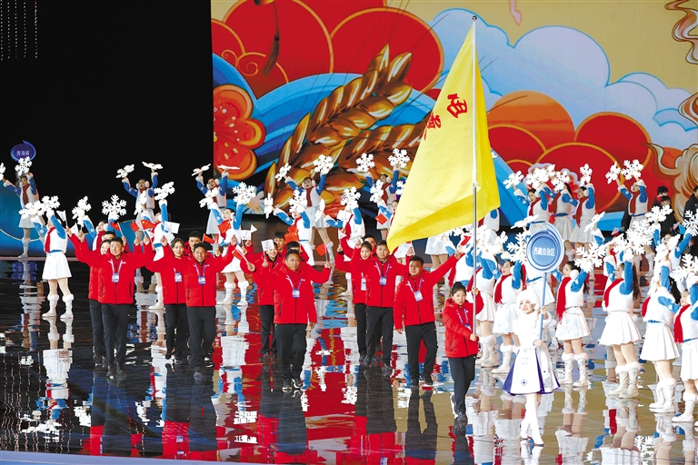 圖為西藏代表團(tuán)亮相第十四屆全國冬季運動會開幕式。洛桑 索朗群培 攝