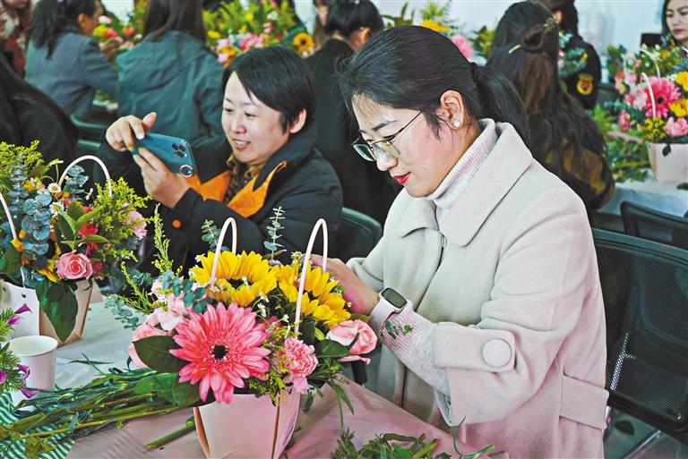 近日,拉薩市堆龍德慶區(qū)婦聯(lián)開展“巧手插花綻芳華·魅力巾幗展風采”花藝培訓(xùn)特色課程。圖為婦女在制作花藝作品。 拉巴桑姆 攝