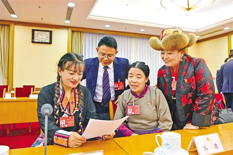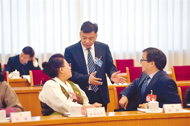 圖為西藏全國人大代表在會(huì)議間隙溝通交流。