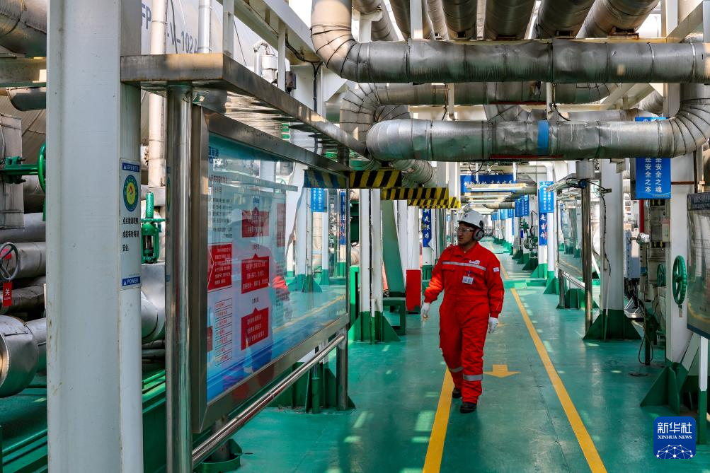 強巴在秦皇島32-6油田“渤海世紀號”(FPSO)16萬噸級浮式生產(chǎn)儲油裝置上觀察設(shè)備運轉(zhuǎn)情況(3月7日攝)。新華社記者 黃耀漫 攝