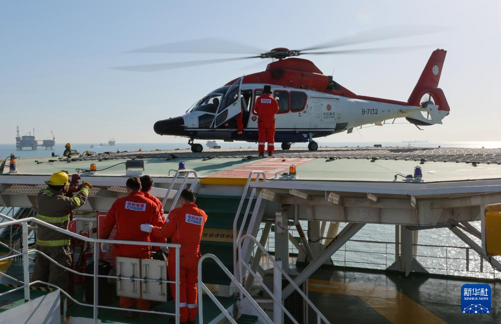 直升機在秦皇島32-6油田“渤海世紀號”(FPSO)16萬噸級浮式生產(chǎn)儲油裝置上降落(3月7日攝)。這是海上石油工人經(jīng)常使用的交通工具。新華社記者 黃耀漫 攝
