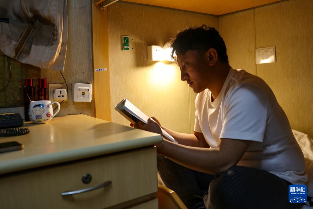 強巴在秦皇島32-6油田“渤海世紀號”(FPSO)16萬噸級浮式生產(chǎn)儲油裝置上休班的時候進行業(yè)務(wù)學(xué)習(xí)(3月7日攝)。現(xiàn)在他正準備中級操作工資格的考試。新華社記者 姜帆 攝