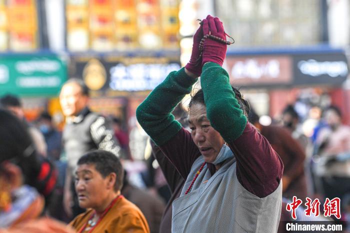3月14日,西藏拉薩,信眾在大昭寺門口朝拜祈福。中新社記者 貢嘎來松 攝