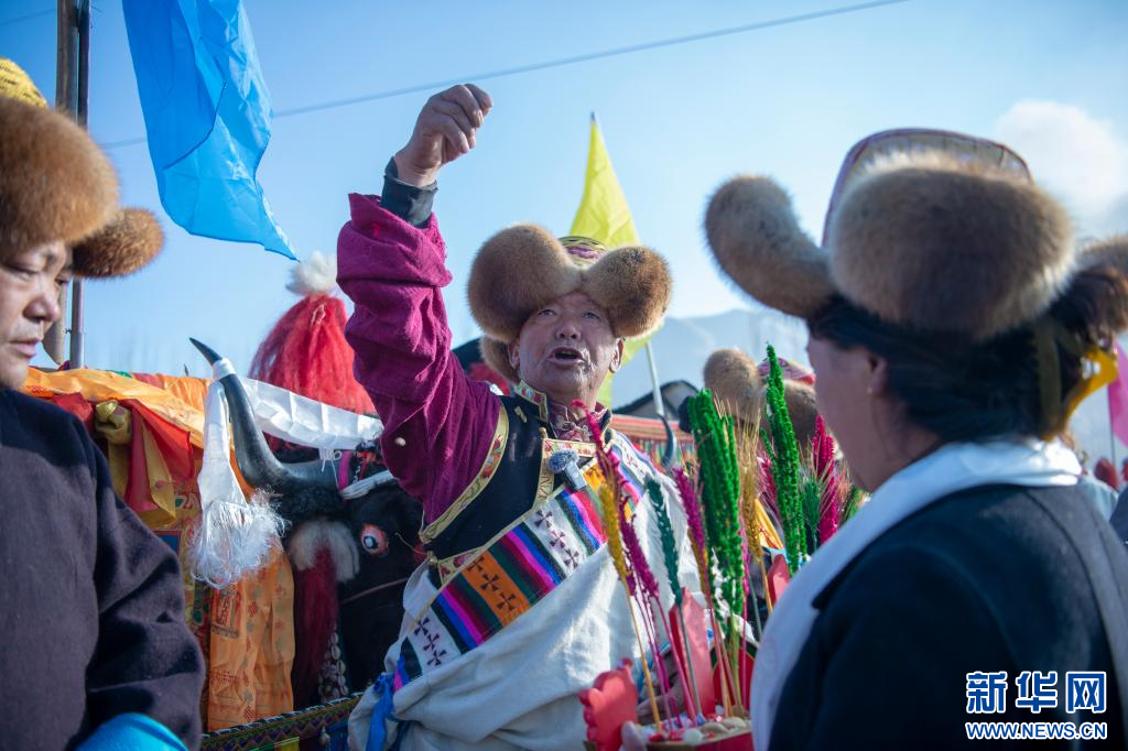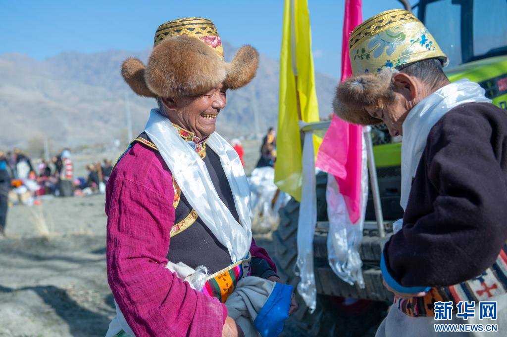 3月16日,克松社區(qū)居民格桑多吉(左)在參加春耕儀式。新華網(wǎng) 旦增努布 攝