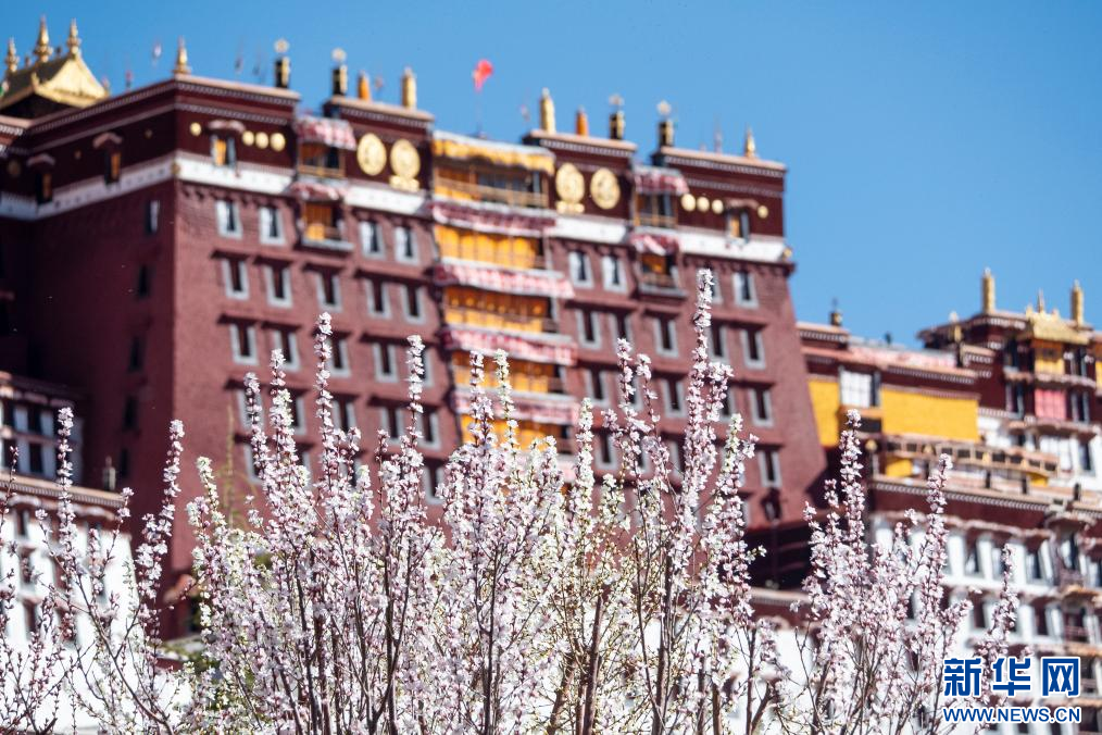 3月15日,杏花映襯下的布達拉宮。新華網(wǎng) 旦增努布 攝