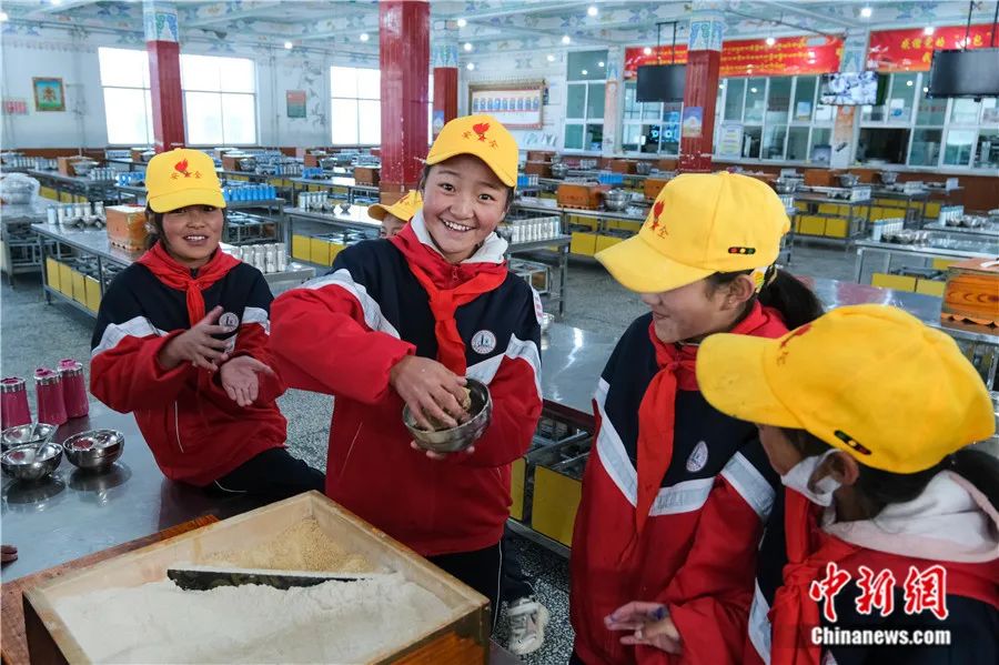 2023年10月13日,班戈縣中石化小學(xué)六年級一班尼瑪拉增(左二)在學(xué)校食堂捏糌粑,孩子們說她們的早餐便是以糌粑為主。該校四至六年級多是寄宿制住校生。江飛波 攝