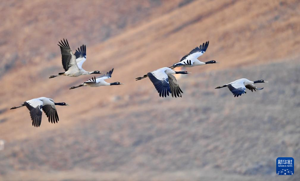 這是在林周縣虎頭山水庫(kù)附近村莊拍攝的黑頸鶴(3月17日攝)。新華社記者 晉美多吉 攝