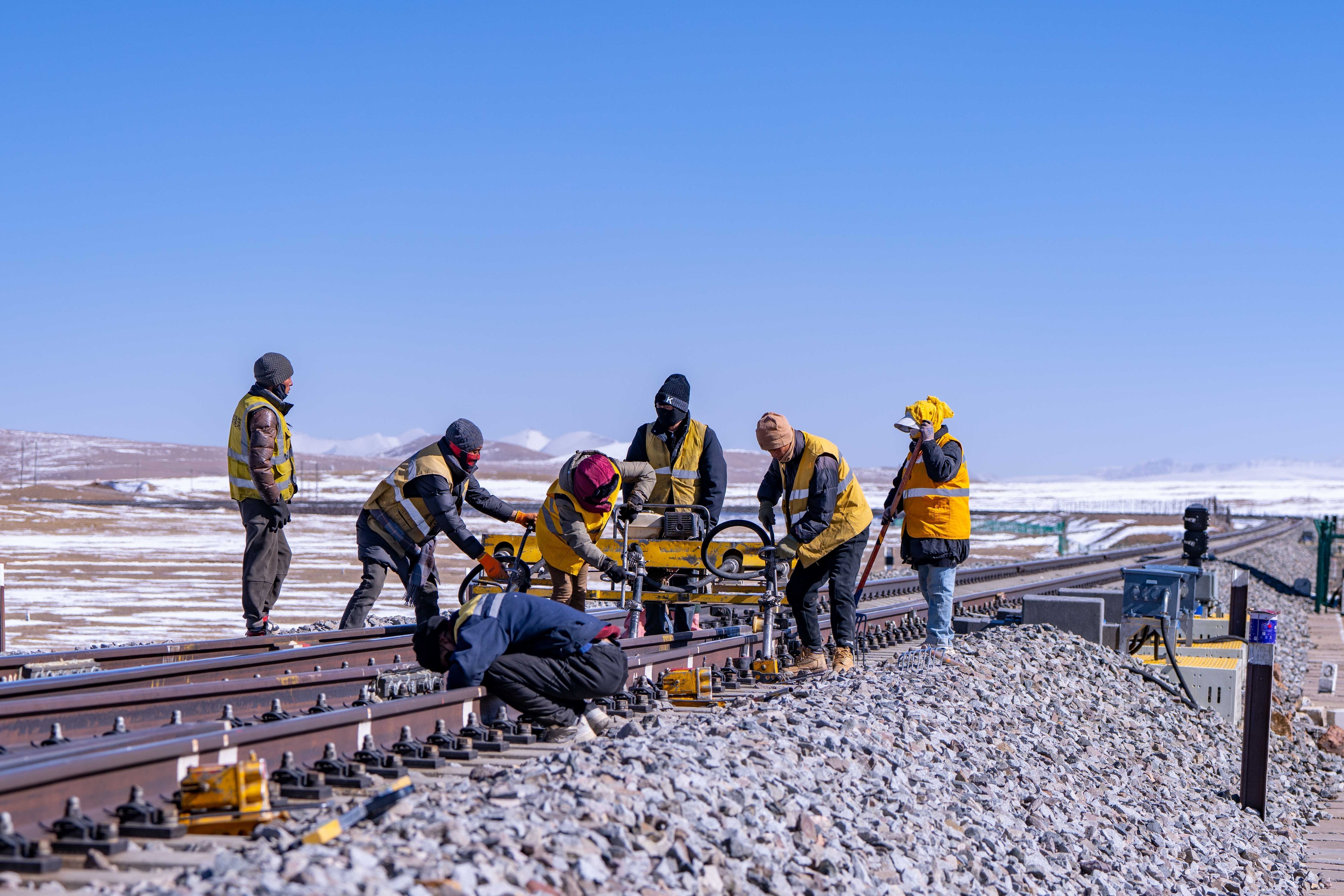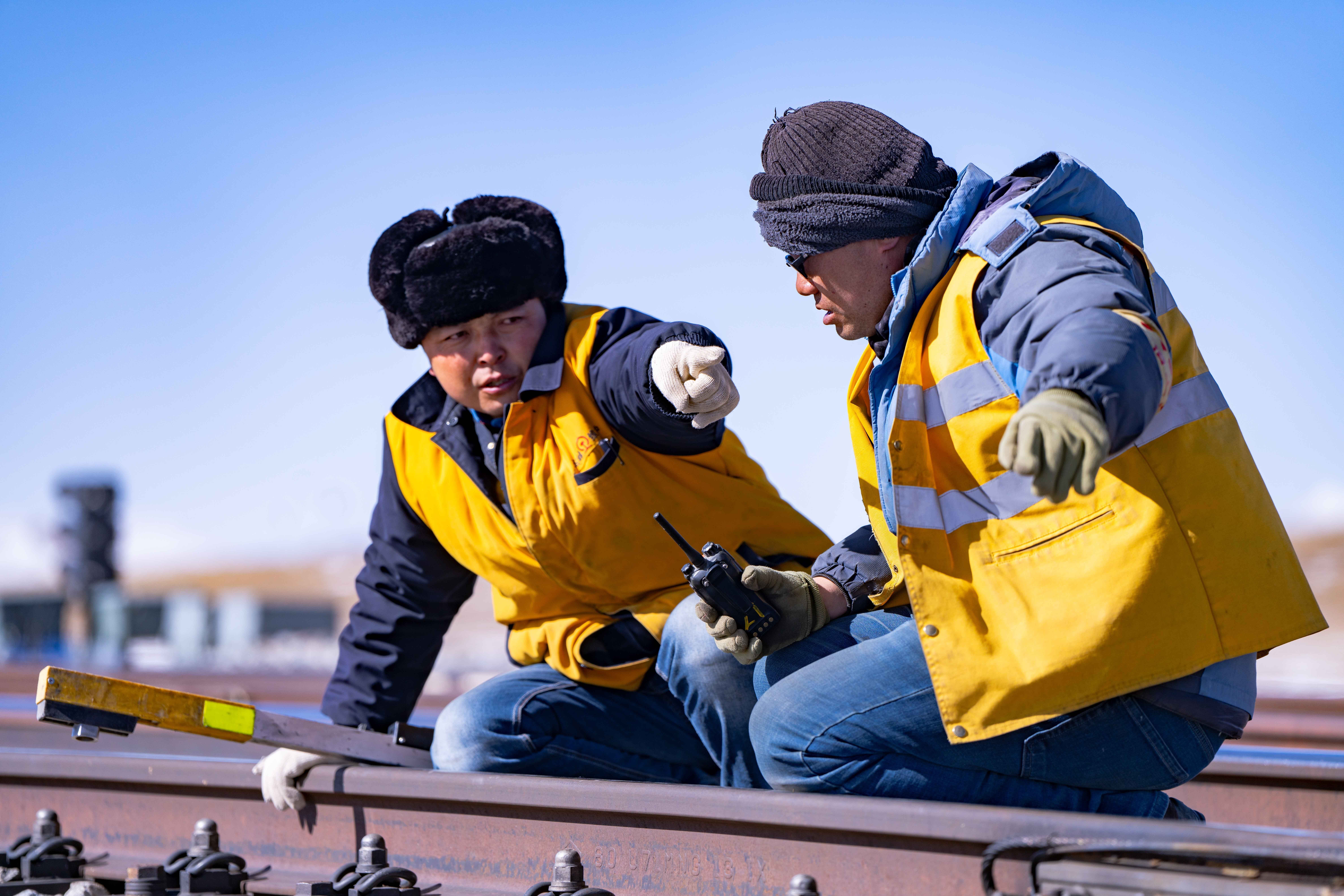 施工時(shí)間有限,工人們的速度不斷加快。馬祎俊指揮安排好幾名鐵路工人,大家各司其職,迅速開(kāi)始動(dòng)手維護(hù)鐵路鋼軌。天氣讓鋼軌比冰塊更加寒冷。隔著佩戴的線手套,依舊能感受到風(fēng)和鐵軌上的寒冷鉆進(jìn)手套里,沁到骨頭里。