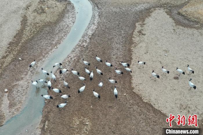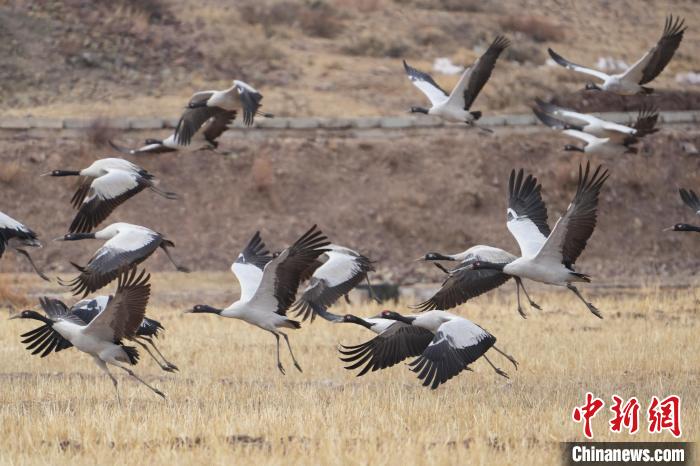 圖為黑頸鶴在林周縣境內(nèi)的農(nóng)田里覓食、嬉戲。貢嘎來(lái)松 攝