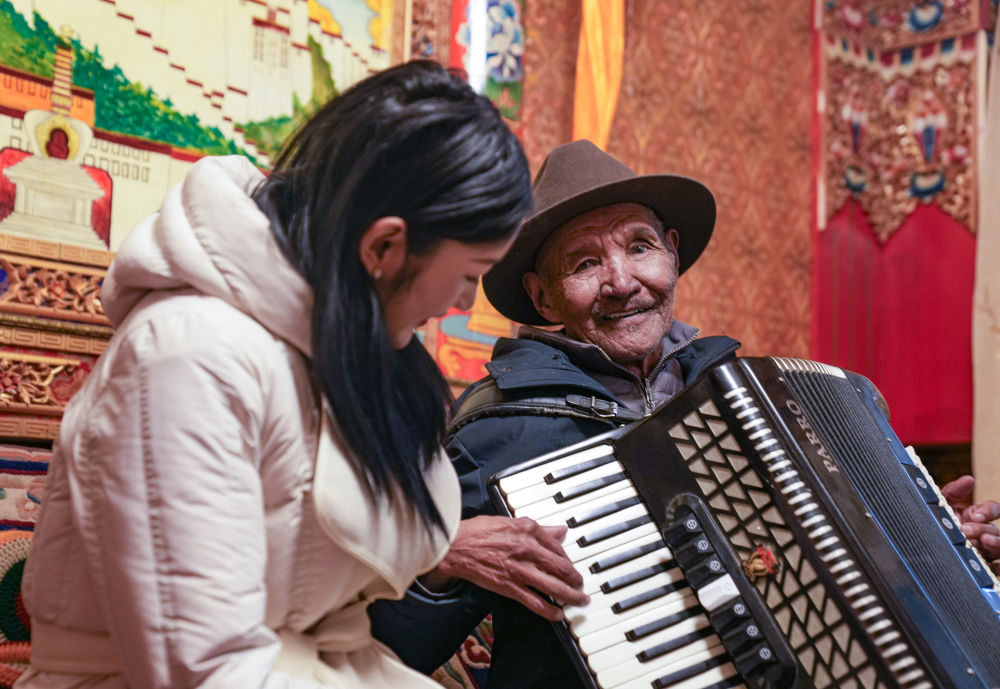 2024年3月14日,嘎東社區(qū)居民朗杰(右)指導(dǎo)孫女索朗曲珍拉手風(fēng)琴。新華社記者 晉美多吉 攝
