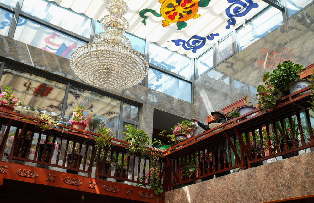 2024年3月14日,嘎東社區(qū)居民朗杰在自家二樓給花澆水。新華社記者 晉美多吉 攝
