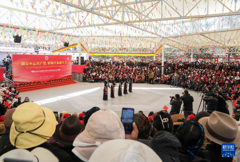 3月28日,群眾在拉薩市宗角祿康公園內(nèi)觀看文藝演出,慶祝西藏百萬農(nóng)奴解放65周年。新華社記者 姜帆 攝