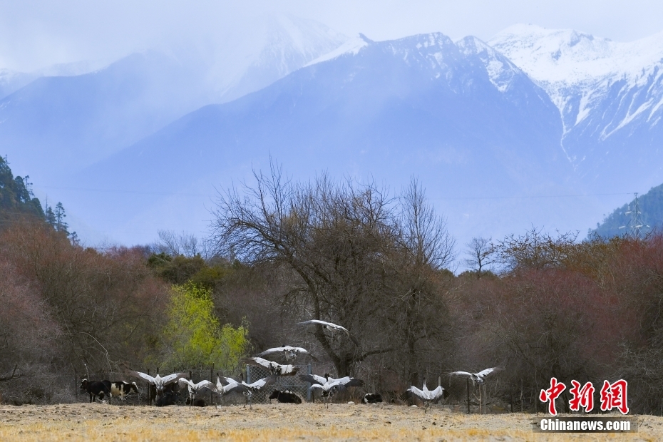 3月30日,在西藏林芝市巴宜區(qū)更章門巴民族鄉(xiāng),黑頸鶴與周邊的村莊、桃花、雪山融為一體,成為春日里的一道靚麗的風(fēng)景線。圖為在雪山前飛翔的黑頸鶴。