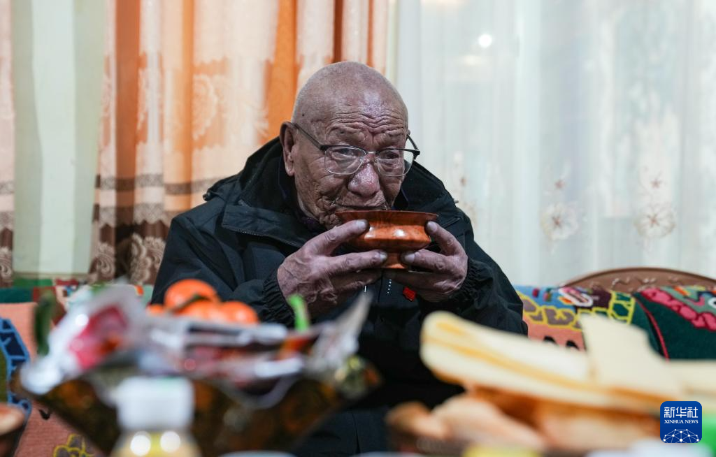 益西桑珠在喝酥油茶(3月13日攝)。新華社記者 晉美多吉 攝