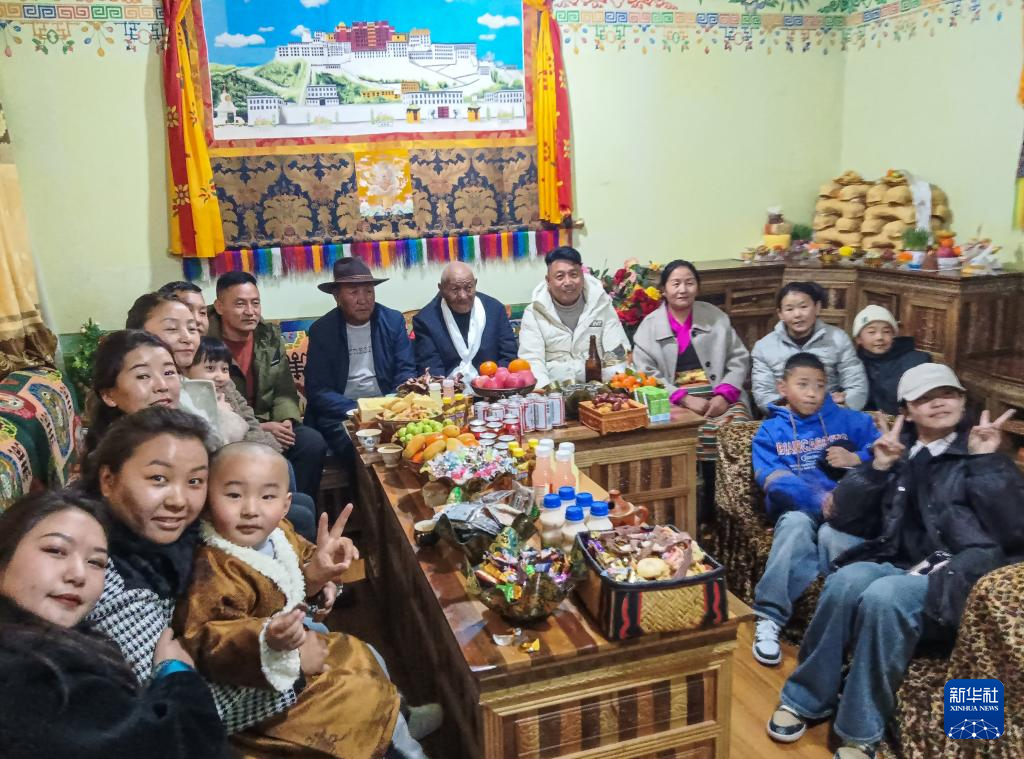 2023年藏歷新年期間,益西桑珠和部分兒孫一起合影。新華社發(fā)