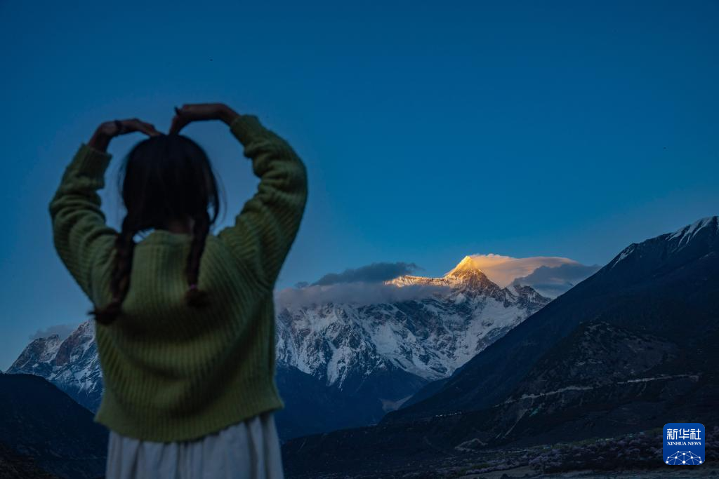 這是在索松村附近拍攝的南迦巴瓦峰夕照(4月1日攝)。新華社記者 孫非 攝