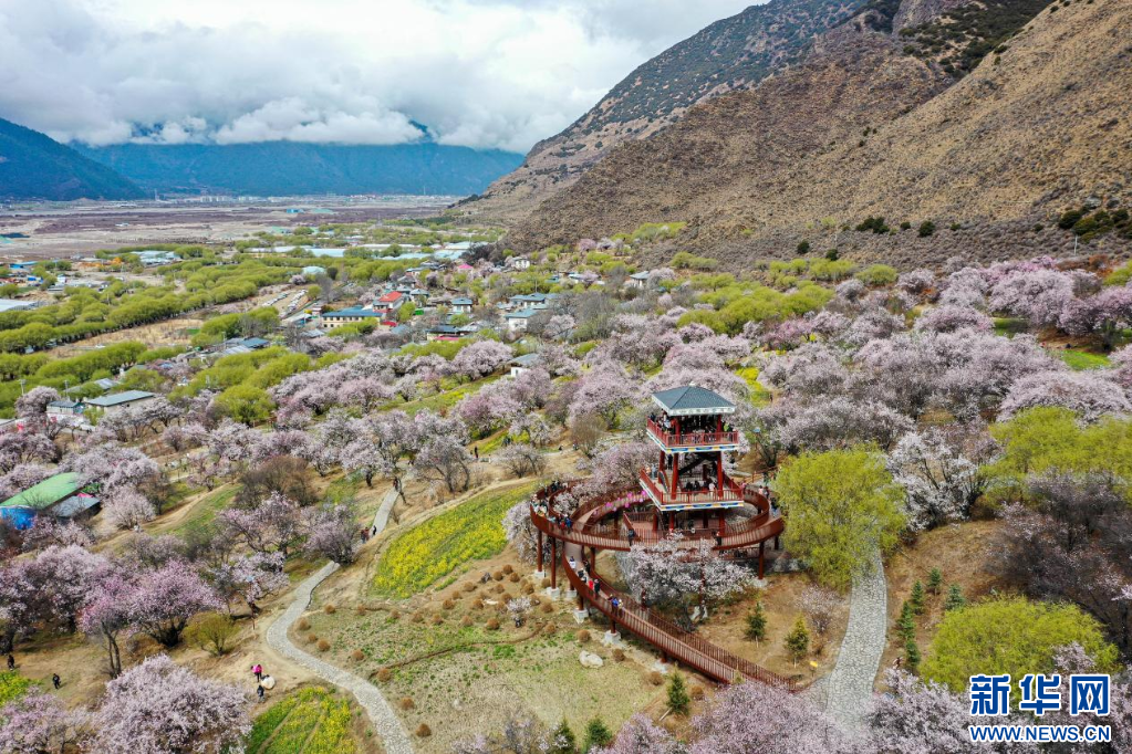 3月31日,林芝市巴宜區(qū)嘎拉村盛開的桃花(無人機(jī)圖片)。新華網(wǎng)發(fā) 李騰 攝