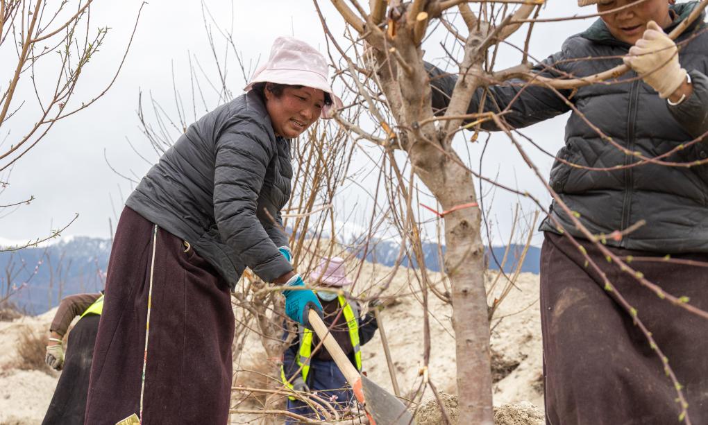 “這里以后也會(huì)成為桃花園!”56歲的嘎拉村村民尼瑪曲吉說。在嘎拉村外尼洋河的河灘上,她和村民們正在種桃樹,挖坑、正苗、培土,累了就唱幾句藏歌。聽到記者叫了一聲“阿佳”(藏語大姐之意),尼瑪曲吉熱情招手。