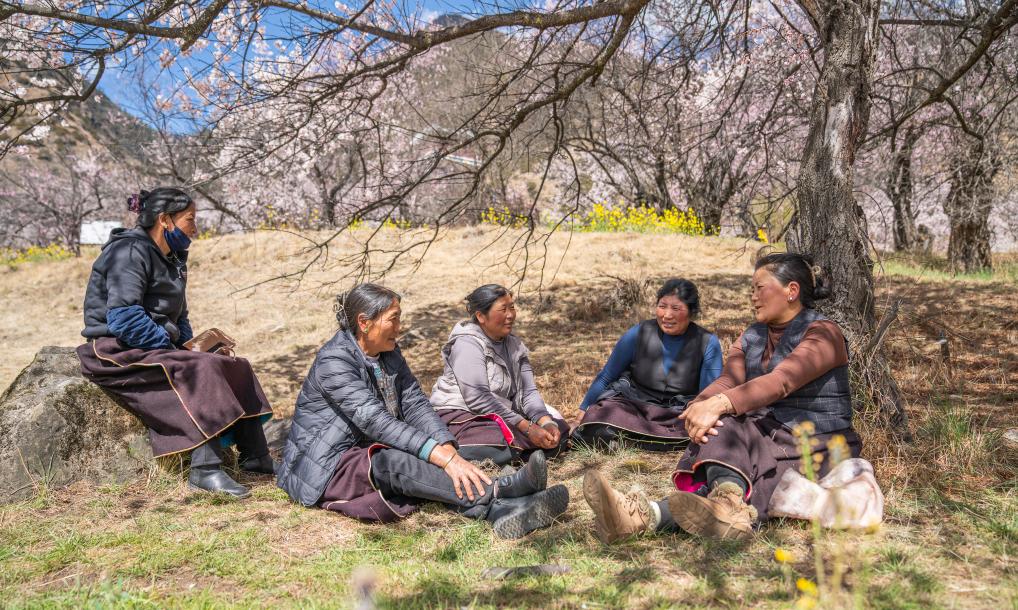 午休時(shí),尼瑪曲吉(右二)與村民在桃樹下聊天(4月1日攝)。新華社記者 丁增尼達(dá) 攝