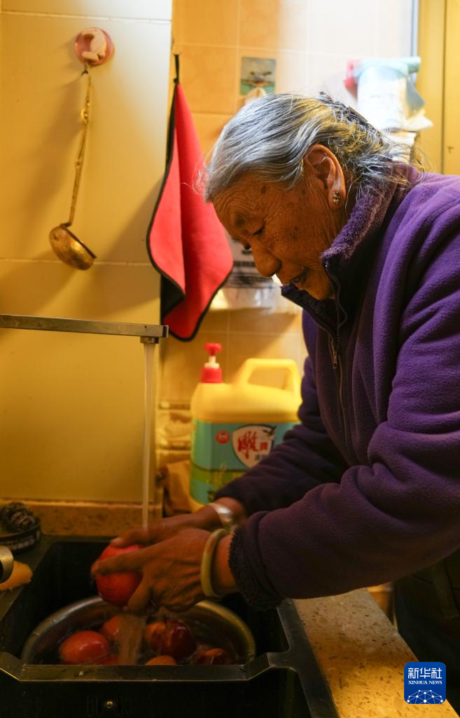 格桑玉珍在家中洗蘋(píng)果(4月3日攝)。新華社記者 晉美多吉 攝