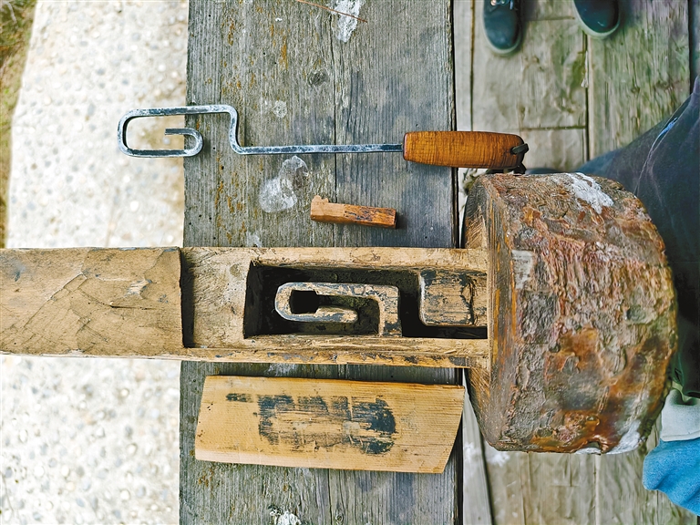 如此精致巧妙的木鎖怎么制作?我們又驅車來到了八蓋鄉(xiāng)巴瑞村,采訪了八蓋木鎖的第六代傳人次久羅布。他告訴我們,制作木鎖,首先要選一整塊的樺樹木,最好是結疤木,按照鎖的要求,用斧頭、鑿子將木頭削成圓形的鎖面和長方形的鎖芯,將鎖面和鎖芯之間掏空,留出鑰匙孔。在長方形的鎖芯中鑿出需要鑰匙進入的形狀,直至孔道與鑰匙嚴絲合縫。再將青岡木制成的栓子放進鎖芯前端被掏出的小孔中,并為鎖面覆上一層木板。這樣,一個木鎖便大致完成了。
