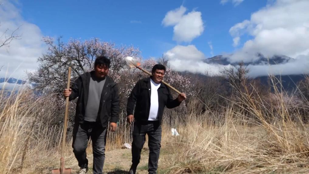 早春,雪域高原逐漸從寒冬中復(fù)蘇。西藏林芝的山林之中,桃花如云霞般綻放。一片芳菲景象中,新一年的生機(jī)與繁榮正在孕育。這天一早,羌渡崗村的兩名干部又一次來到了他們牽掛的村集體果園,查看長勢(shì),整理土地。