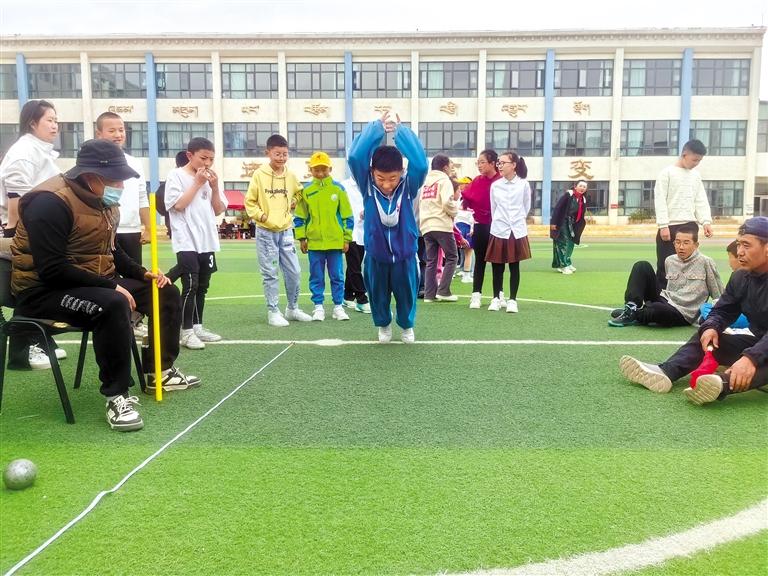 拉薩市第三小學(xué)學(xué)生參加立定跳遠(yuǎn)項(xiàng)目比賽。次仁平措