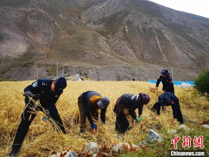 圖為貢當(dāng)邊境派出所民警幫助當(dāng)?shù)剞r(nóng)民秋收。日喀則邊境管理支隊供圖