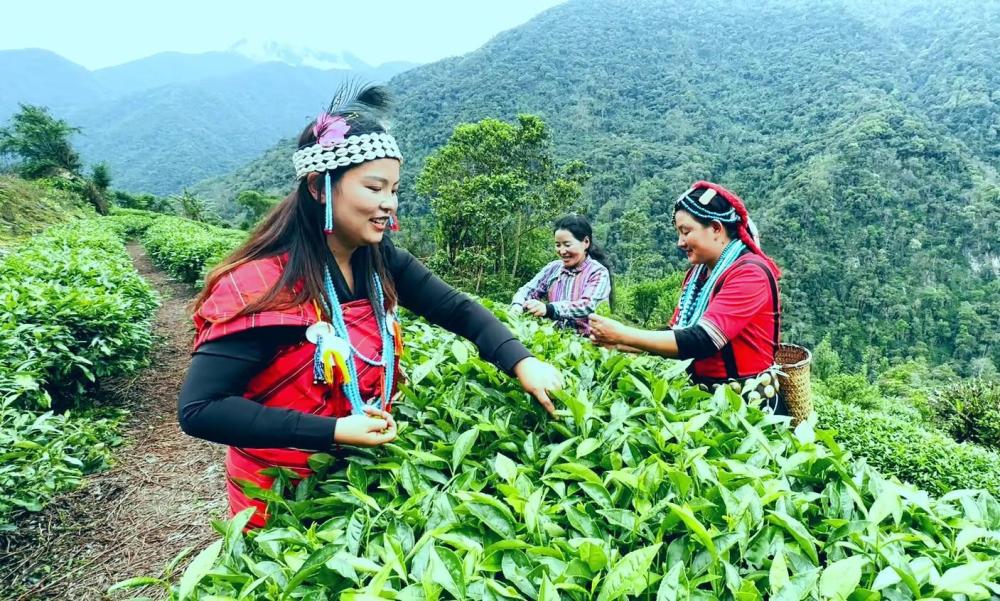 茶廠里人頭攢動、歡聲笑語,珞巴族女子穿梭在茶樹之間,單手輕輕一旋,嫩葉飄然入簍,不一會兒,簍里已是一片青綠。