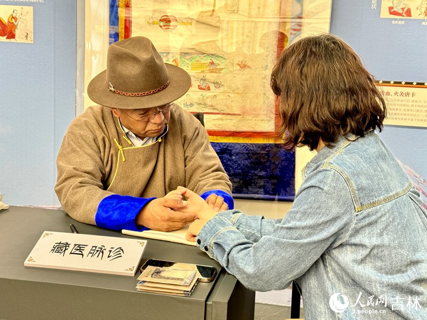 西藏自治區(qū)藏醫(yī)院藏醫(yī)主任醫(yī)師尼瑪為觀眾脈診、講解藏藥知識。人民網(wǎng)記者 李思玥 攝