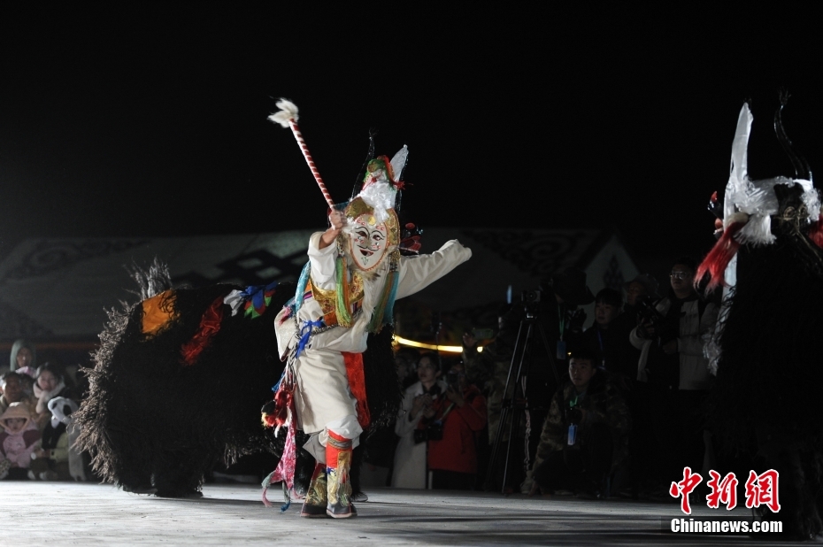 5月18日晚,西藏拉薩市當(dāng)雄縣納木錯(cuò)湖畔,當(dāng)?shù)啬撩駧в慰腕w驗(yàn)篝火鍋莊舞。納木錯(cuò),被譽(yù)為“天湖”,吸引著大量游客前來(lái)觀光。圖為篝火鍋莊舞晚會(huì)上的文藝演出。