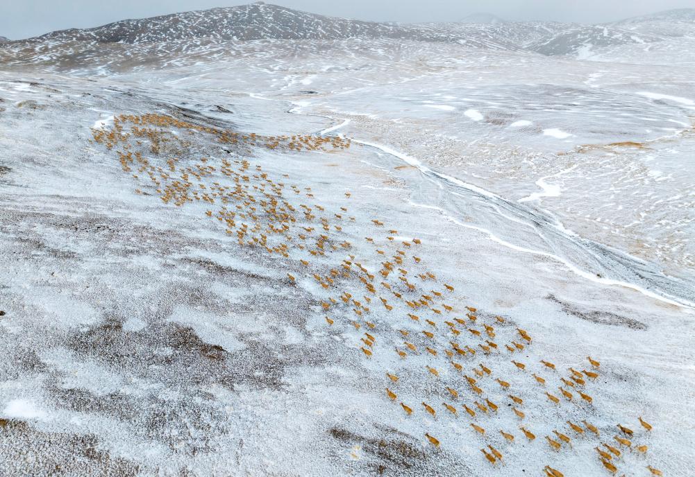 大群藏羚羊正在向產(chǎn)羔地遷徙(無(wú)人機(jī)照片,5月10日攝)。新華社記者 姜帆 攝