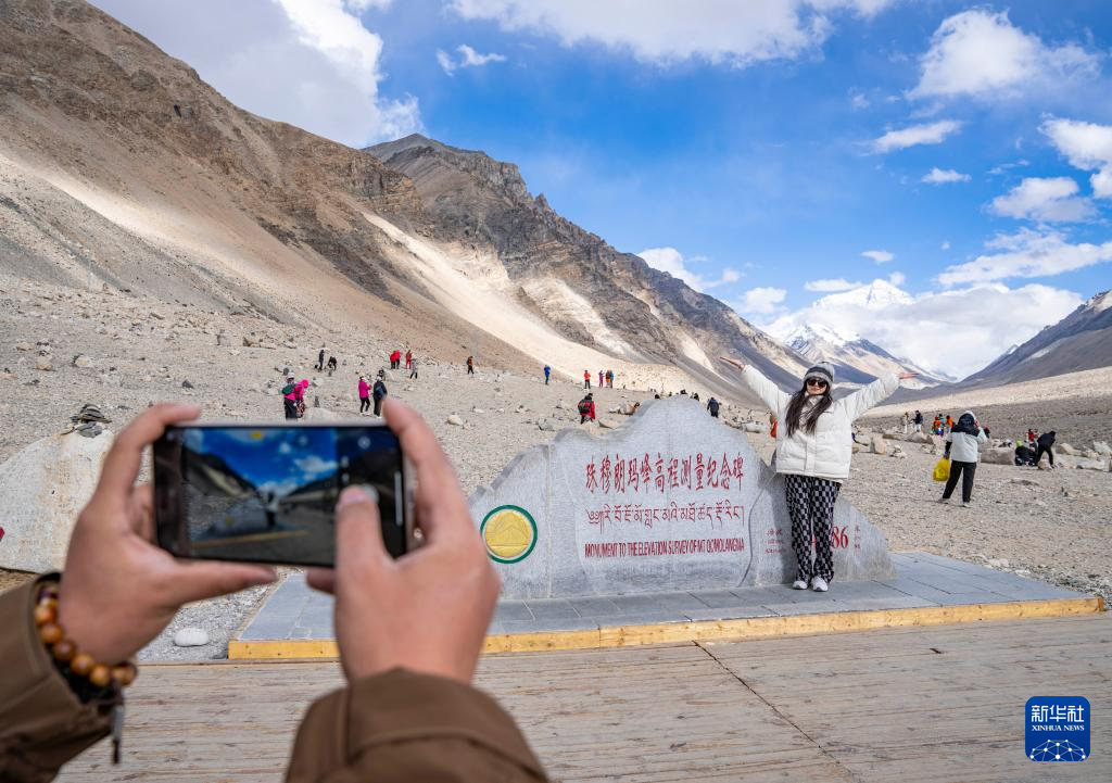 游客在珠穆朗瑪峰高程測量紀念碑前拍照留念(5月24日攝)。