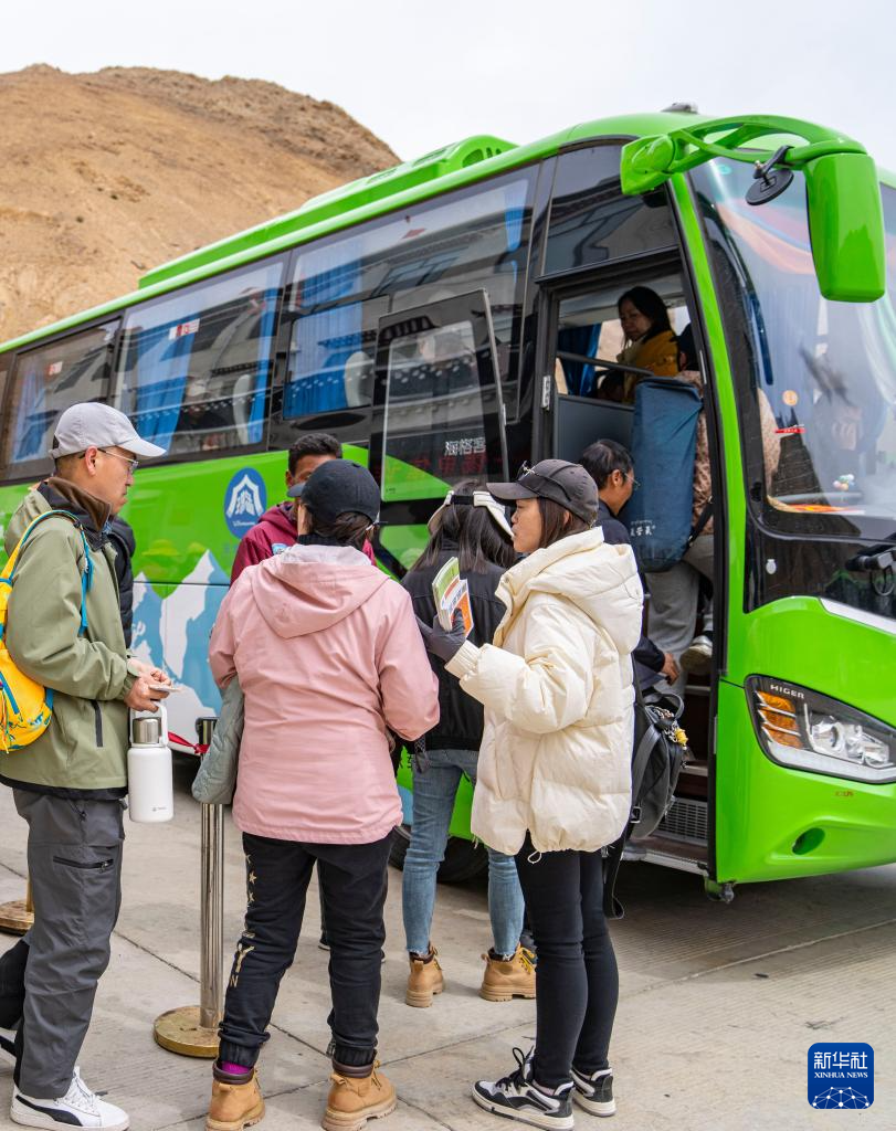 游客在珠穆朗瑪國家公園內(nèi)排隊換乘環(huán)保大巴車(5月20日攝)。