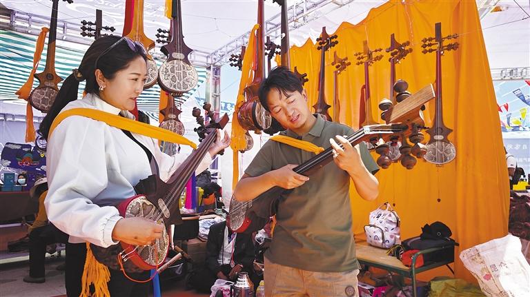 在日喀則高原農(nóng)特產(chǎn)品及尼泊爾特色產(chǎn)品展示展銷活動上,商家向顧客介紹扎念琴。記者 扎西頓珠 旦增嘎瓦 攝
