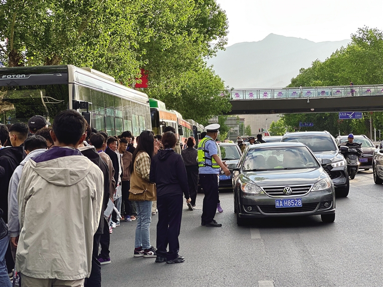 6月7日8點(diǎn),太陽(yáng)剛剛升起,拉薩中學(xué)考點(diǎn)附近人頭攢動(dòng)。一輛輛愛(ài)心送考的公交車依次停靠在馬路邊,學(xué)生們排隊(duì)等候安檢進(jìn)場(chǎng),考點(diǎn)大門(mén)口的喇叭重復(fù)播放著考生進(jìn)考場(chǎng)的溫馨提示。