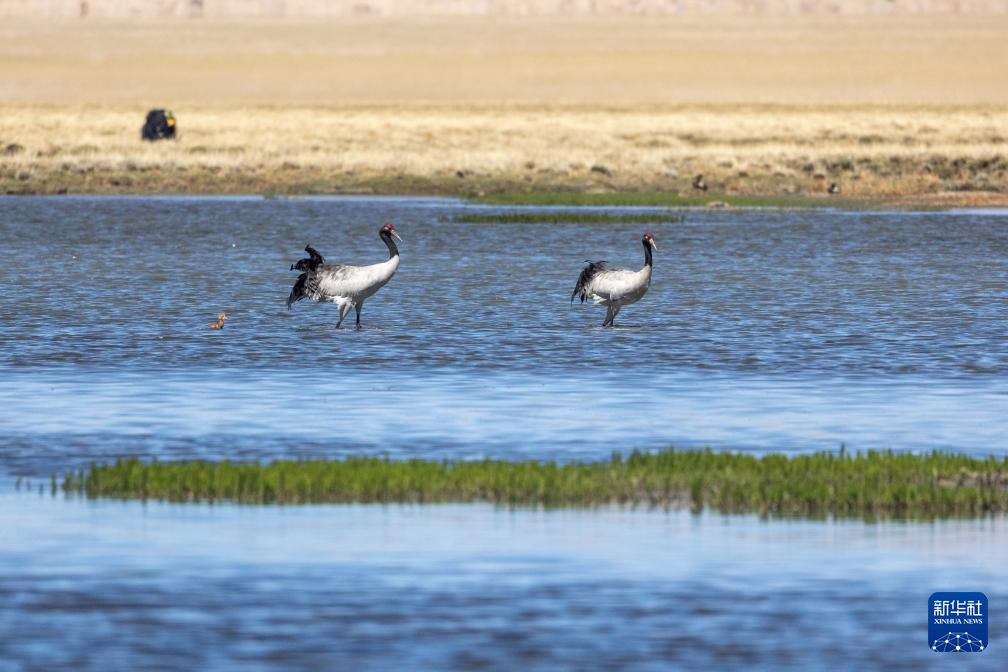 6月9日,一對黑頸鶴夫婦帶著雛鳥在西藏那曲市申扎縣一處濕地棲息、覓食。新華社記者 晉美多吉 攝