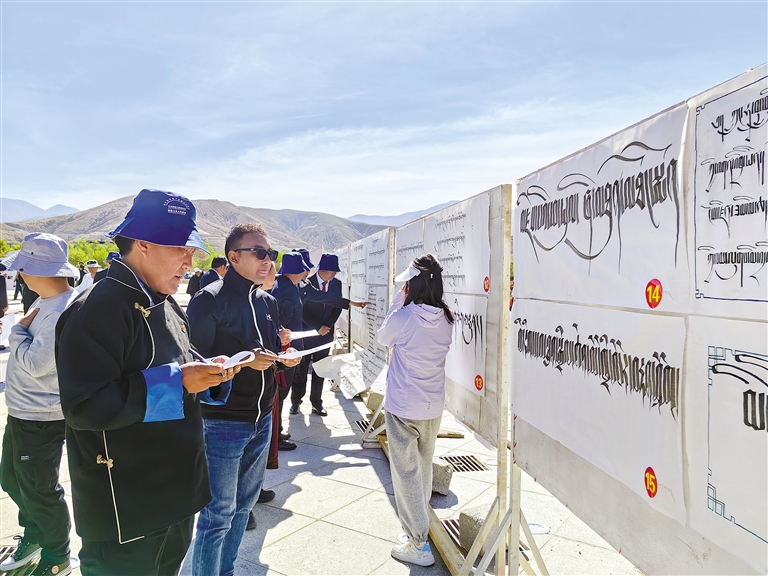 在謝通門(mén)縣開(kāi)展的書(shū)法、繪畫(huà)、攝影比賽中,評(píng)委在為作品打分。