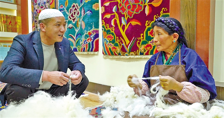 江孜縣組織開(kāi)展民族文化、民族手工業(yè)、民族飲食、民族服裝等沉浸式體驗(yàn)活動(dòng)。這是回族群眾在體驗(yàn)傳統(tǒng)服裝制作工序。