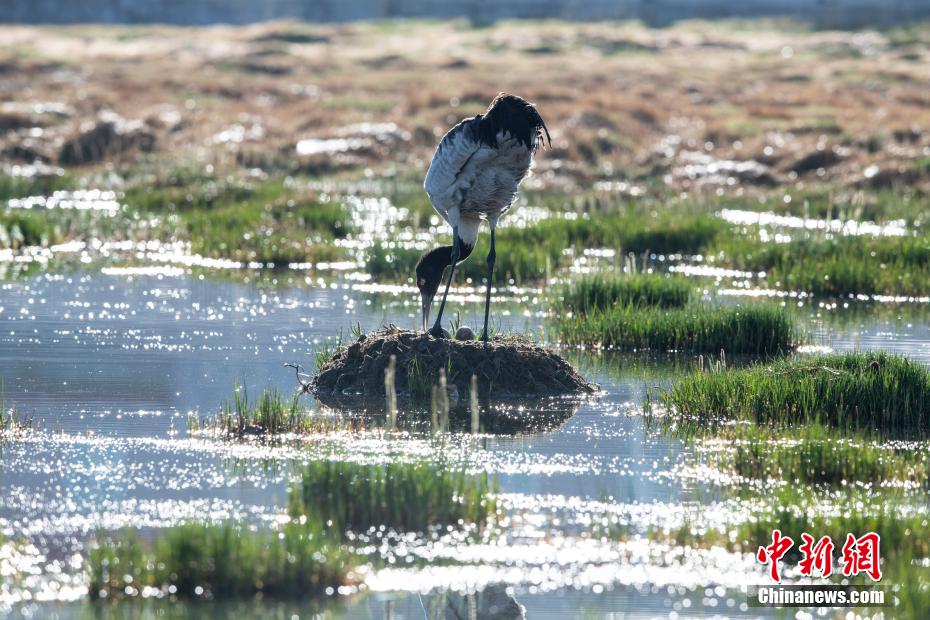 6月12日,西藏那曲市申扎縣濕地里一只黑頸鶴正準備孵蛋。申扎縣,平均海拔超過4500米,是黑頸鶴在中國的主要繁殖地之一。每年4月到6月,成群的黑頸鶴會來到這里,筑巢、孵化、養(yǎng)育下一代。近年來,為了保護這些珍貴的生靈,申扎縣采取了一系列措施,設(shè)立了監(jiān)測站,對黑頸鶴的棲息地進行24小時監(jiān)控,確保它們的繁殖不受干擾。黑頸鶴是國家一級保護動物,也是世界上唯一一種生長、繁殖在高原的鶴類。貢嘎來松 攝